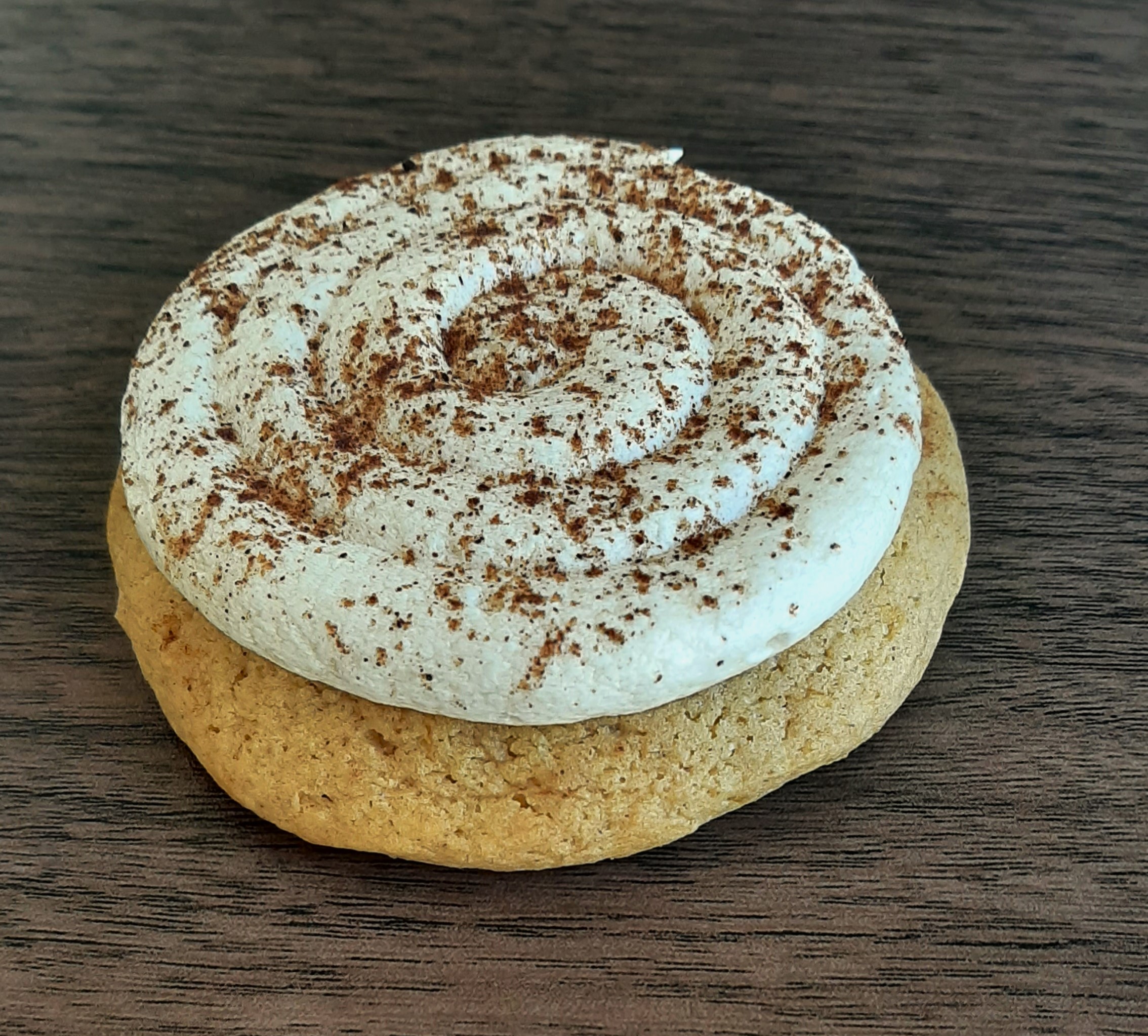a fluffy pumpkin cookie topped with caramel cream cheese frosting and a dusting of pumpkin pie spice